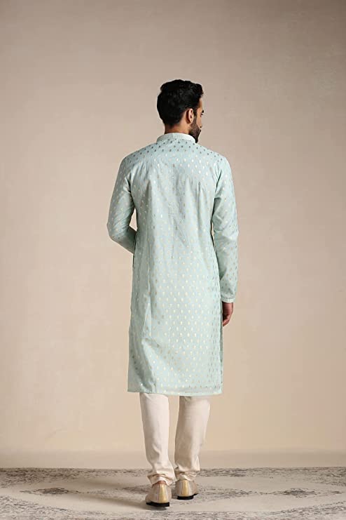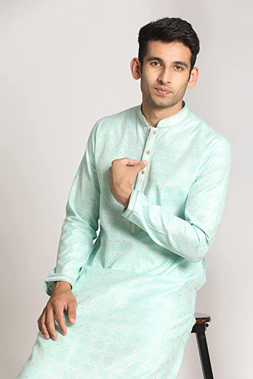 Manyavar Kurta Set for Men, Full Sleeves Mandarin Collar Ethnic Men’s Kurta Set for Engagement, Wedding, Party Blended Cotton Printed (Pista)