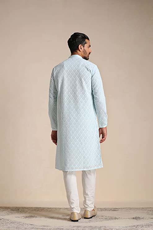 Manyavar Kurta Set for Men, Full Sleeves Mandarin Collar Ethnic Men’s Kurta Set for Engagement, Wedding, Party Blended Cotton All Over Self Design (Blue)