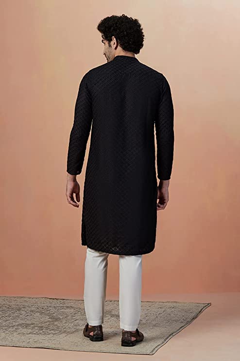 Manyavar Kurta Set for Men, Full Sleeves Mandarin Collar Ethnic Men’s Kurta Set for Engagement, Wedding, Party Blended Cotton Embroidery (Black)