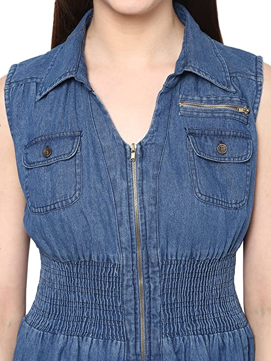 StyleStone Women’s Denim Knee Length Zip Dress with Smocked Waistline (3113ZipDress)